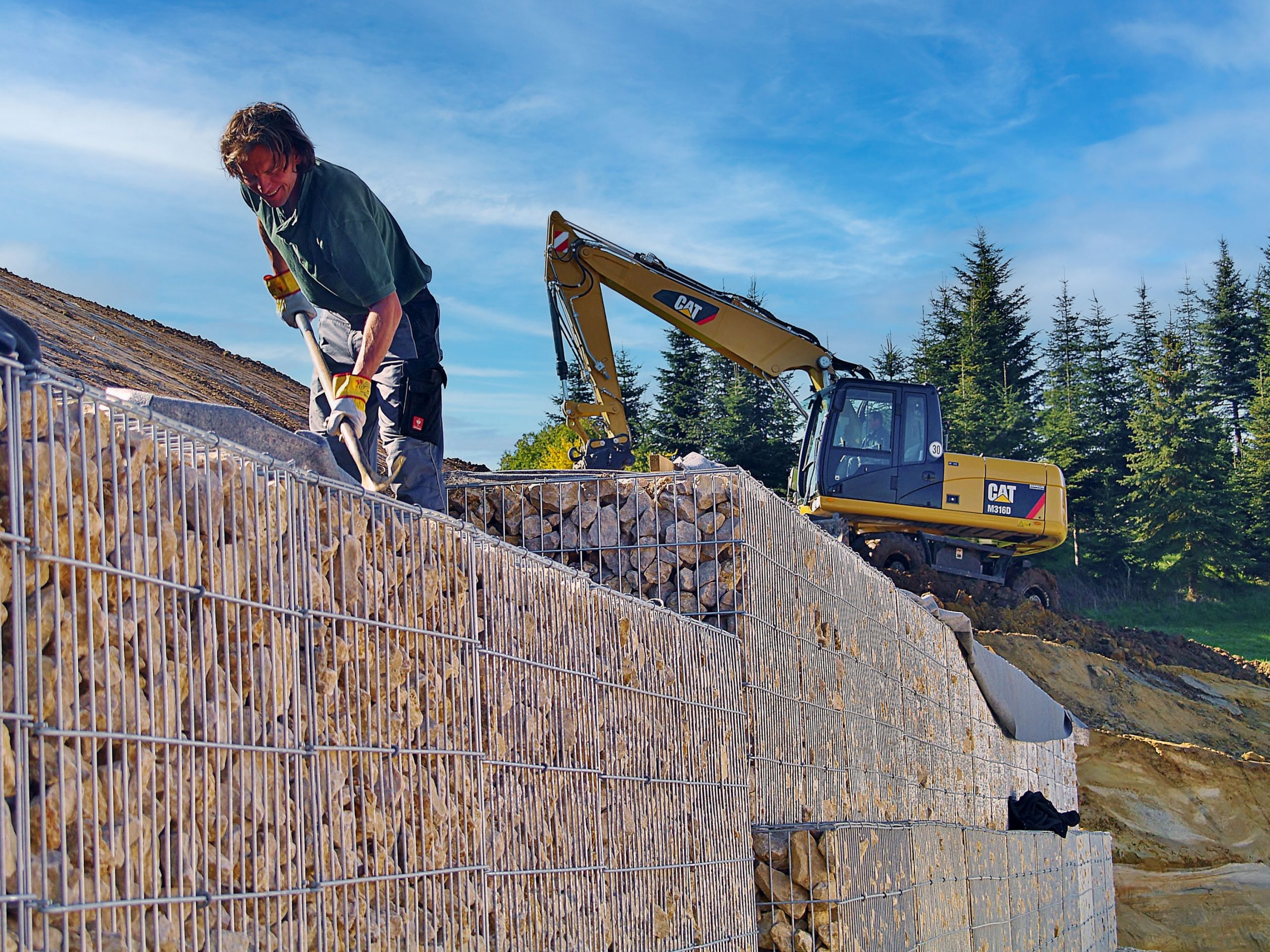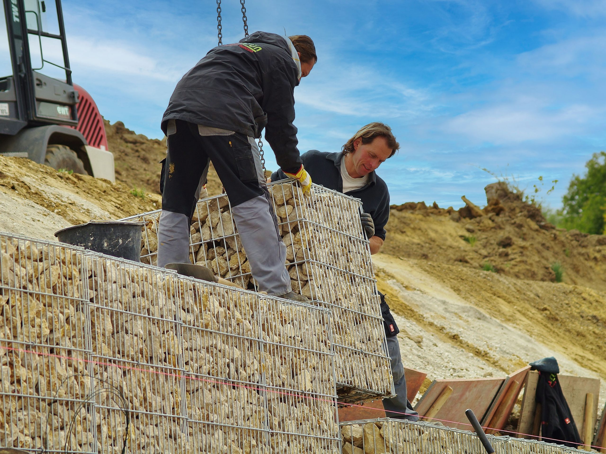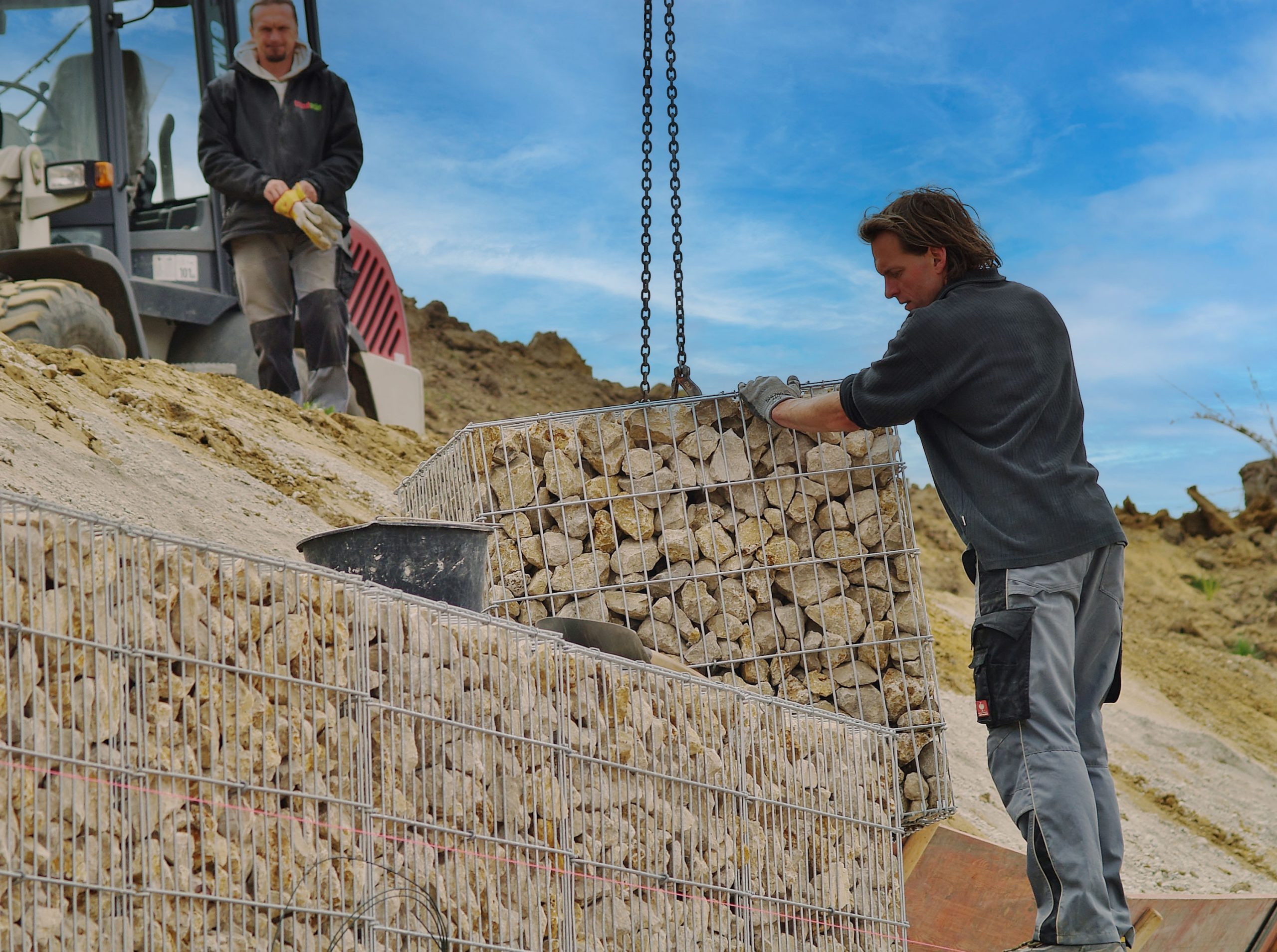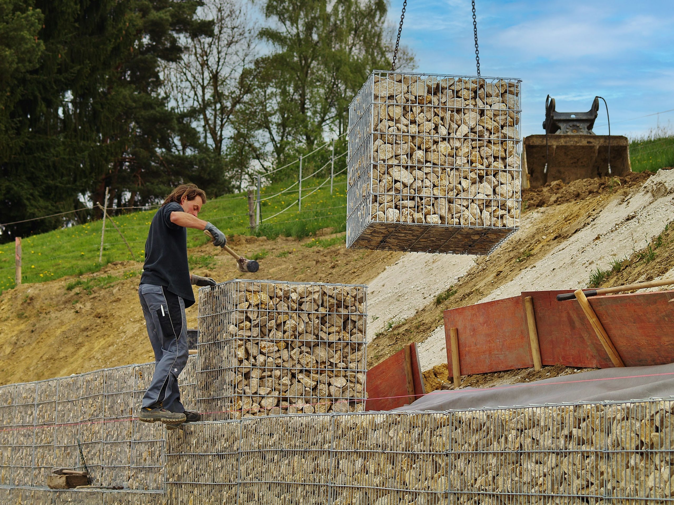Gartengestaltung in Steillagen bedarf immer einer bautechnischen Geländeabstützung. Je steiler der Hang, um so massiver die Abstützung. Mit Gabionen, auch Drahtschotterkörbe genannt, können Hangsituationen abgestützt, bzw. terrassiert werden. Die Fertiggabionen können relativ schnell eingebaut werden, allerdings bedarf diese Bauart einem erheblichen Maschineneinsatz, der sich in den Baukosten wiederfindet.